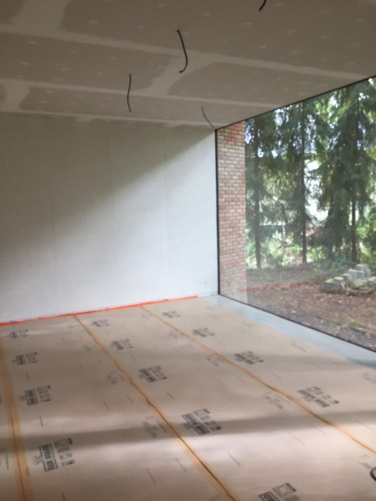 Aansluitingen zoals vloer-wand en wand-plafond dienen 100 % luchtdicht gemaakt te worden. Wanneer twee verschillende materialen op elkaar inwerken, kan er een scheurtje in het pleisterwerk ontstaan en kan er lucht ontsnappen. Door een luchtdichte folie met een elastische lijmlaag te combineren, voorkomen we dergelijke luchtlekken. We verlijmen onze folie altijd volvlaks. Dat betekent dat een rechtstreeks contact met beide oppervlakken ontstaat.